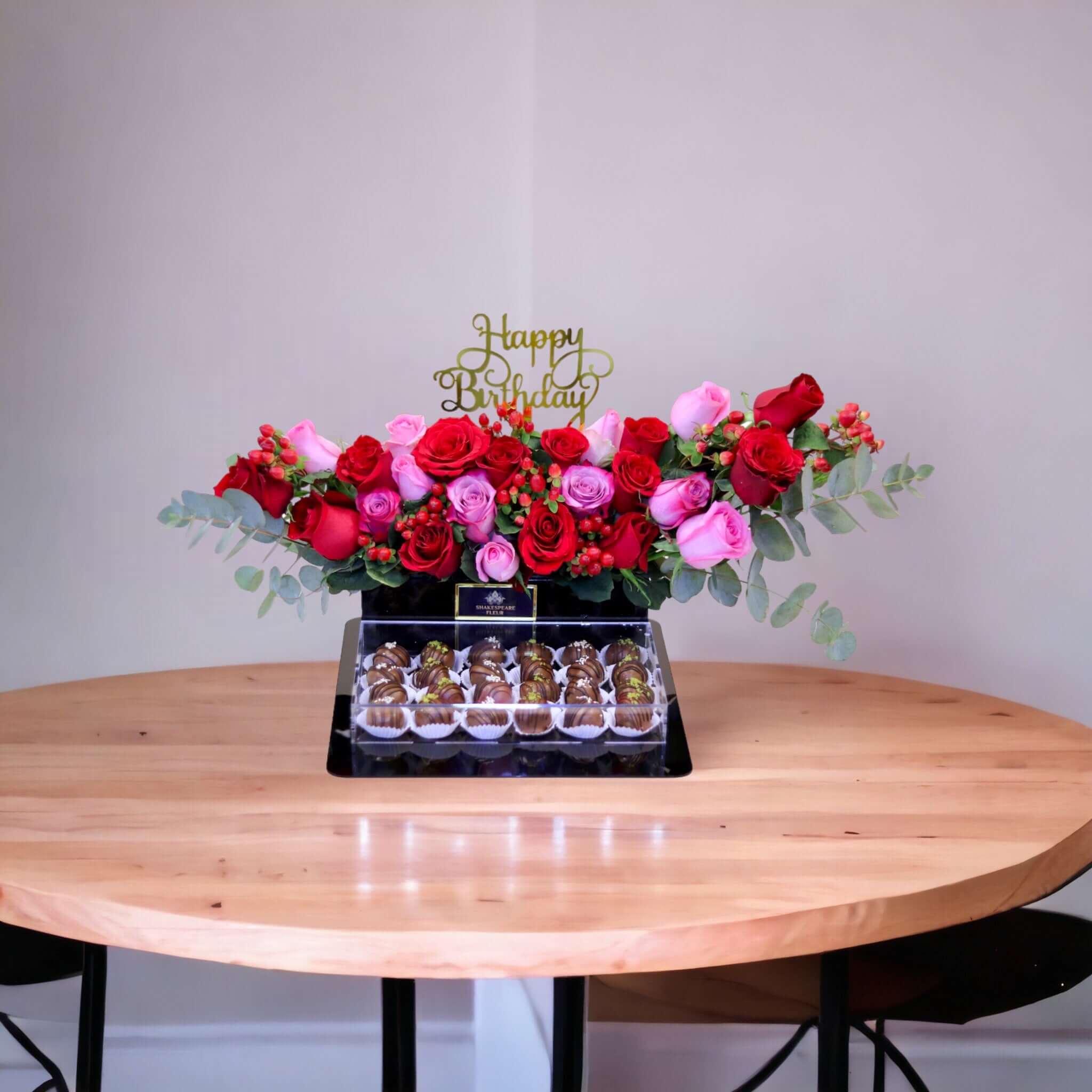 | 24 ROSES, 7 HAYBRICOM, 24 FRESH TRAFFLES CHOCOLATES, ACRYLIC STAND |