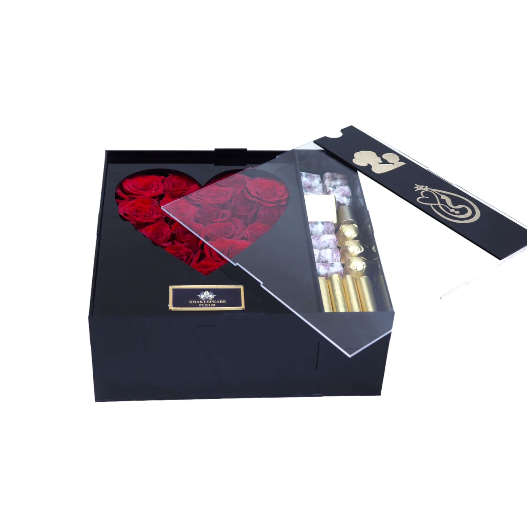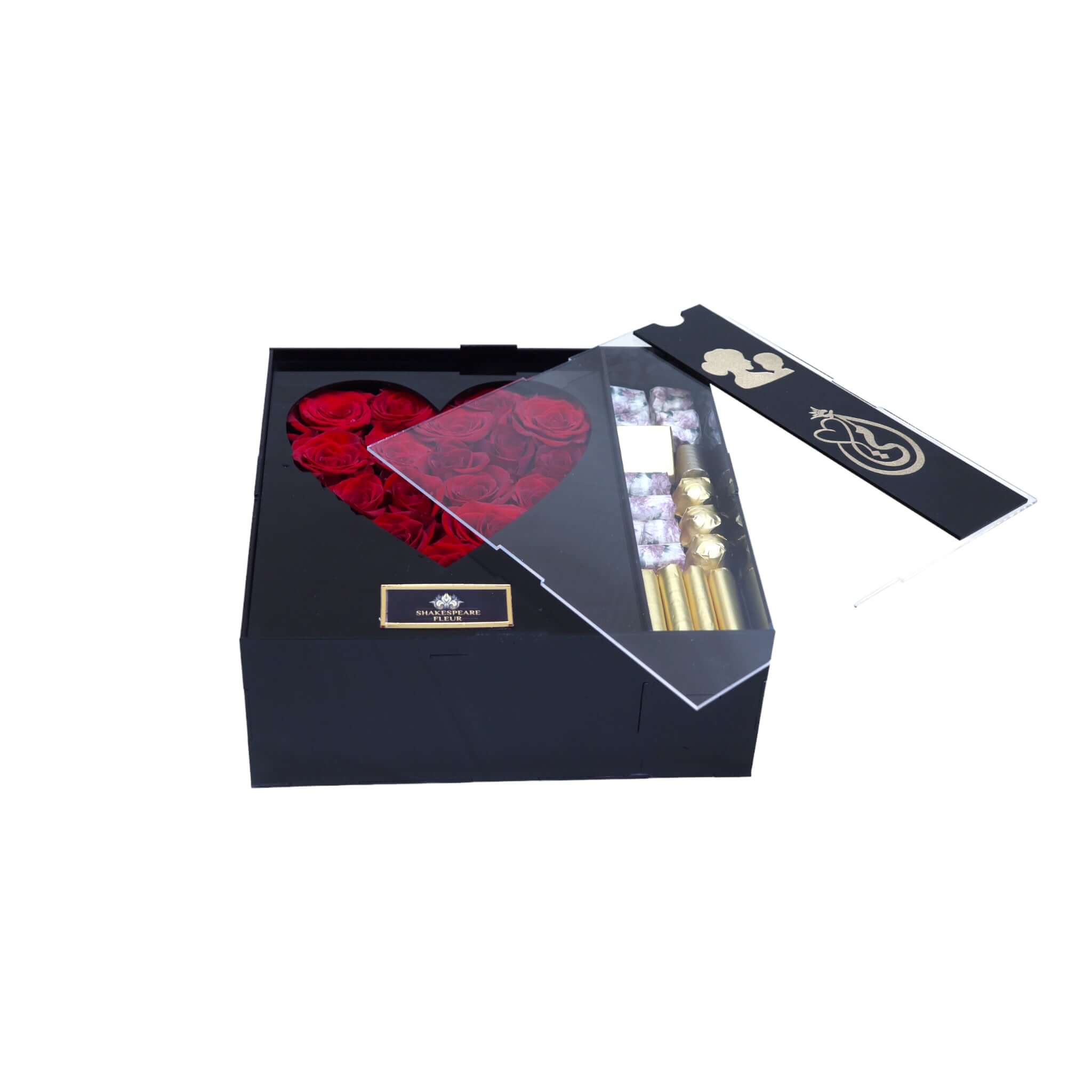 MY MOM ACRYLIC HEART BOX FLOWERS AND CHOCOLATES, 15 TO 20 ROSES, 400GM MIX CHOCOLATES