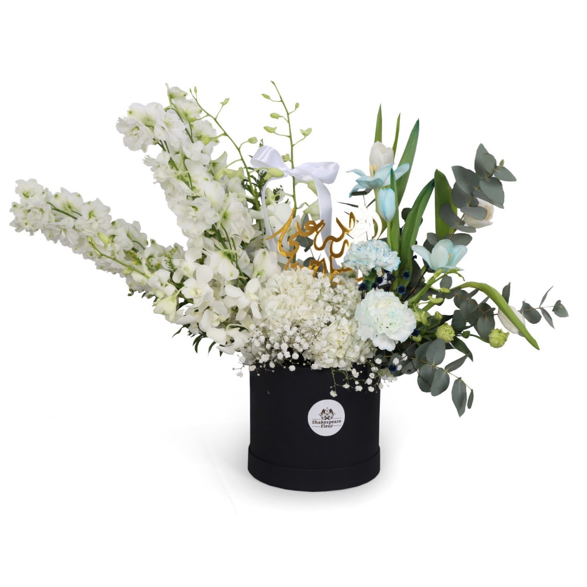 Make your day more enchanting with the 'You're the Best' Flower and Perfume Box. This box includes a luxurious acrylic box, a 100ml VIP perfume, 1 white hydrangeas, 2 pink gerbera daisies, 2 baby rose orange, and a gypsophila