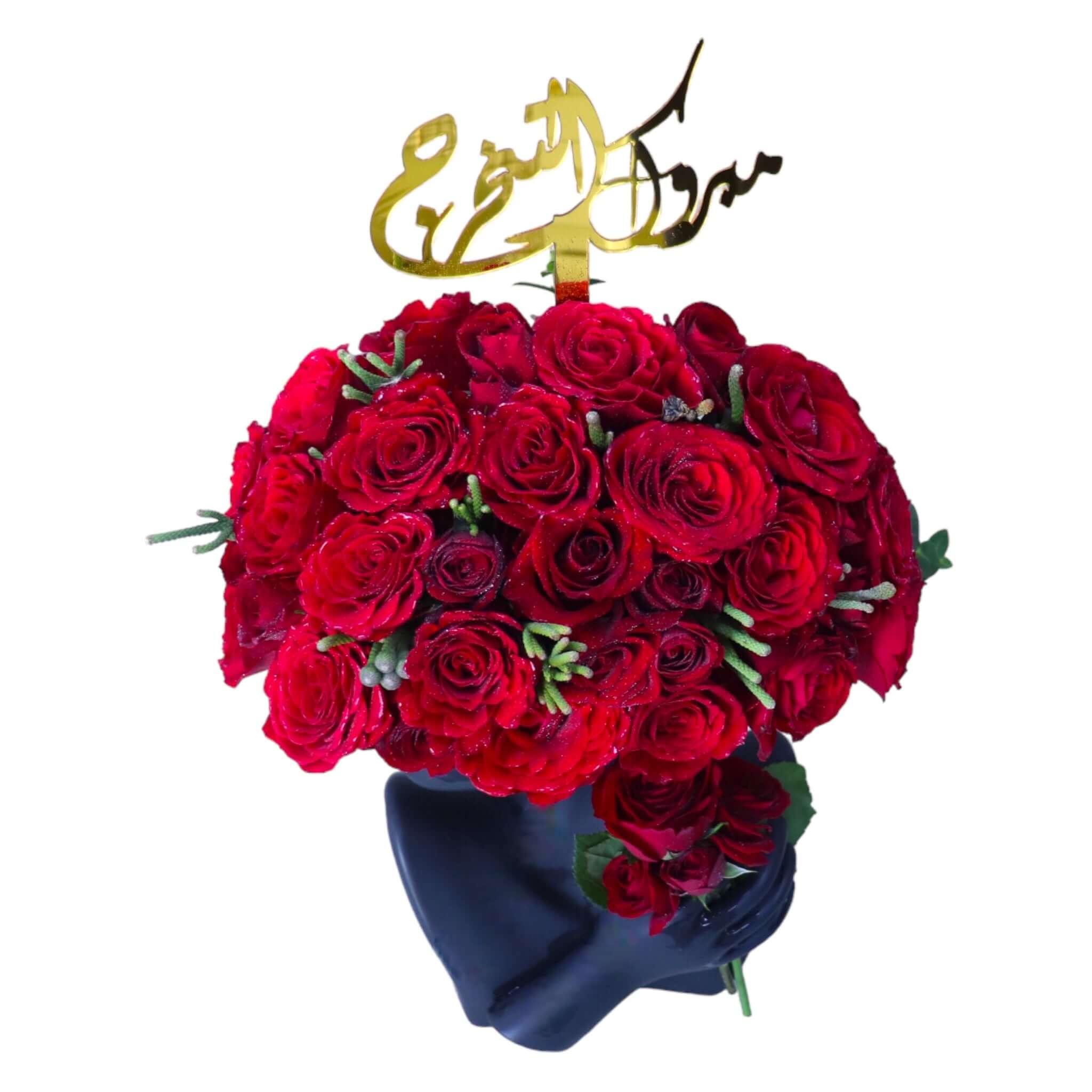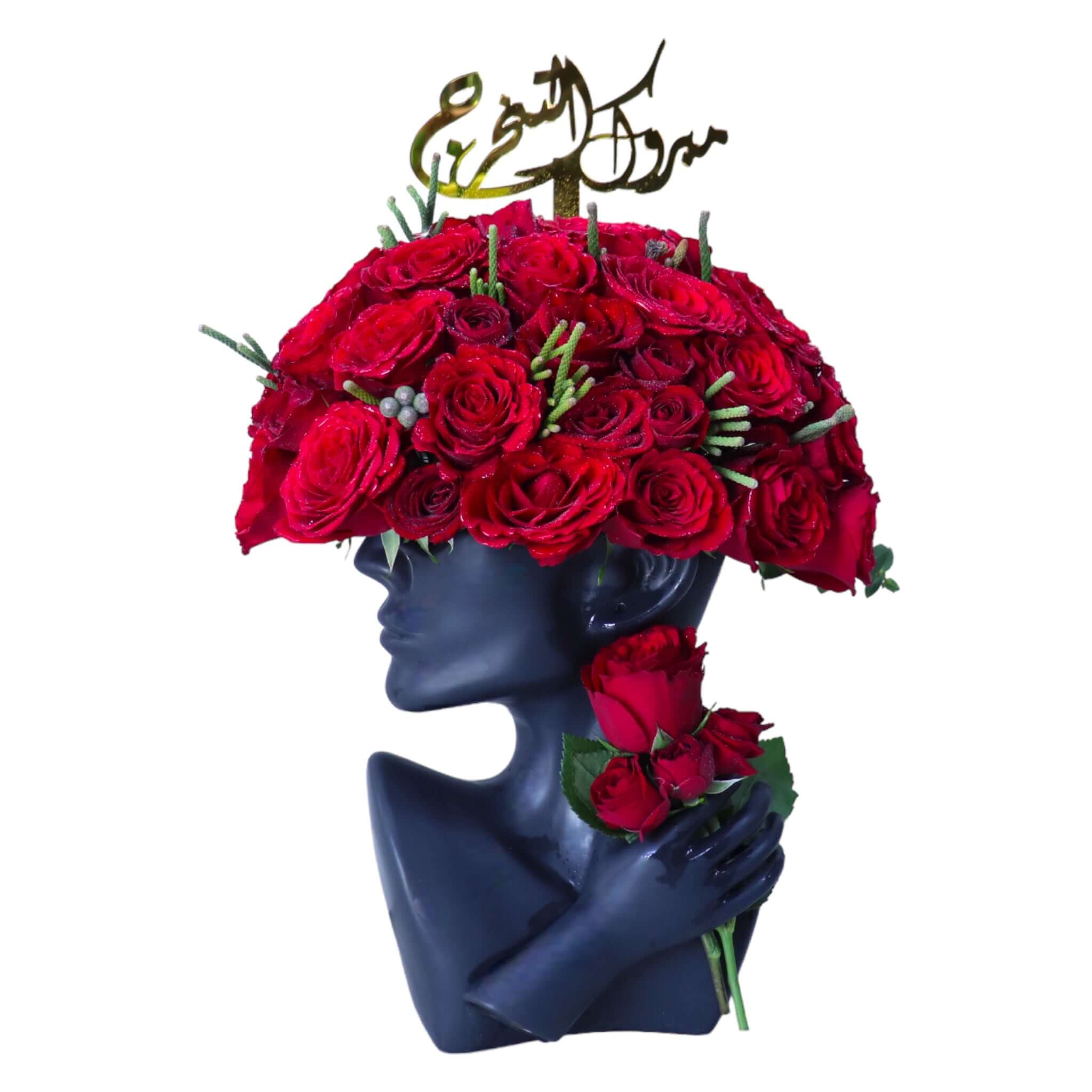 Manikin face,14 Red Flowers , 5 BABY ROSE , 4 HYBRICOM , 3 BORNIA, 1 EUCALPTOUS