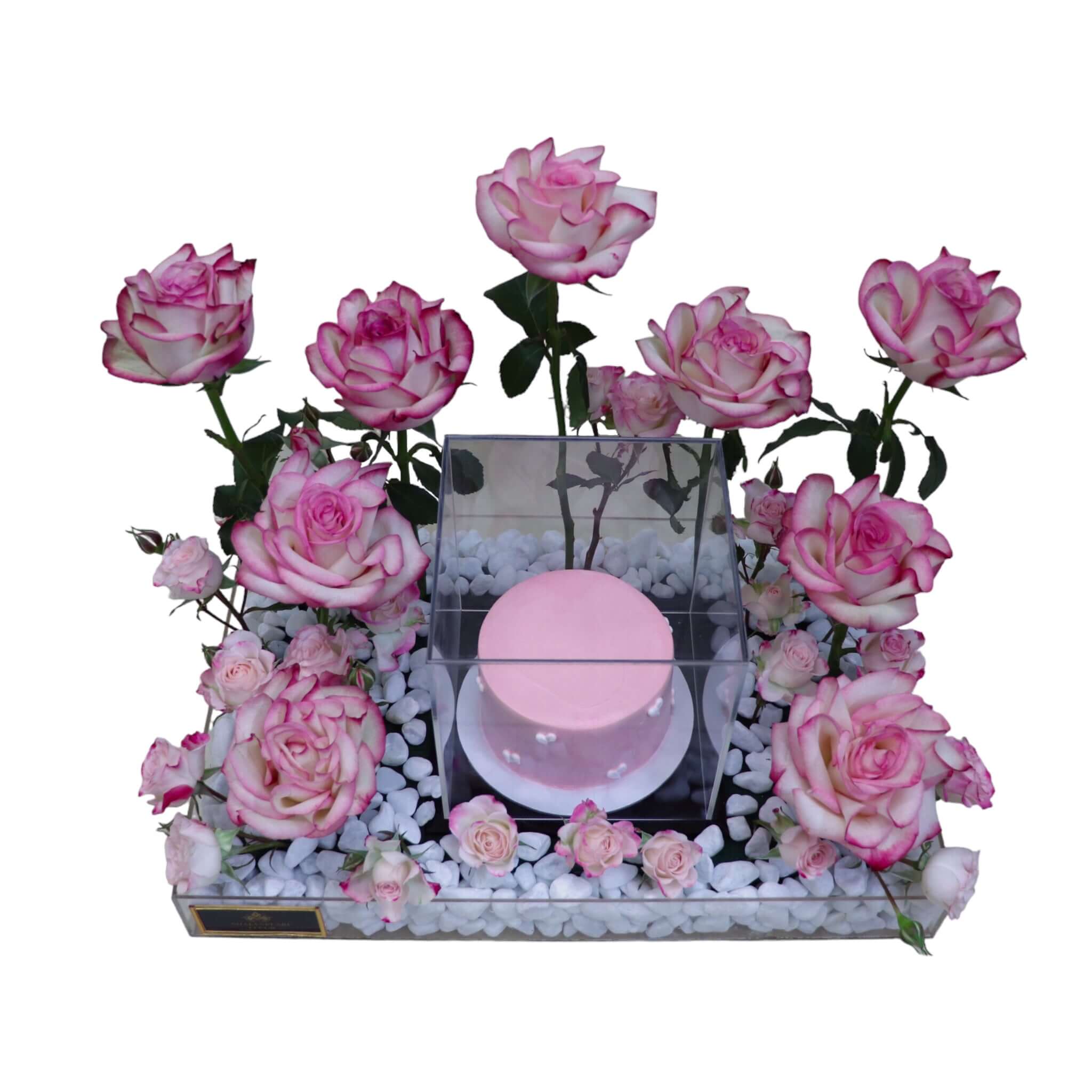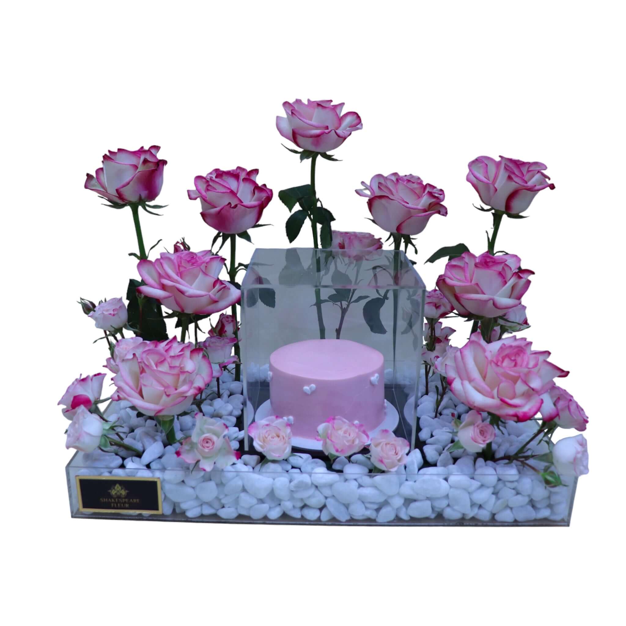 Luxury Acrylic Box with Roses, Baby Roses, and Cake