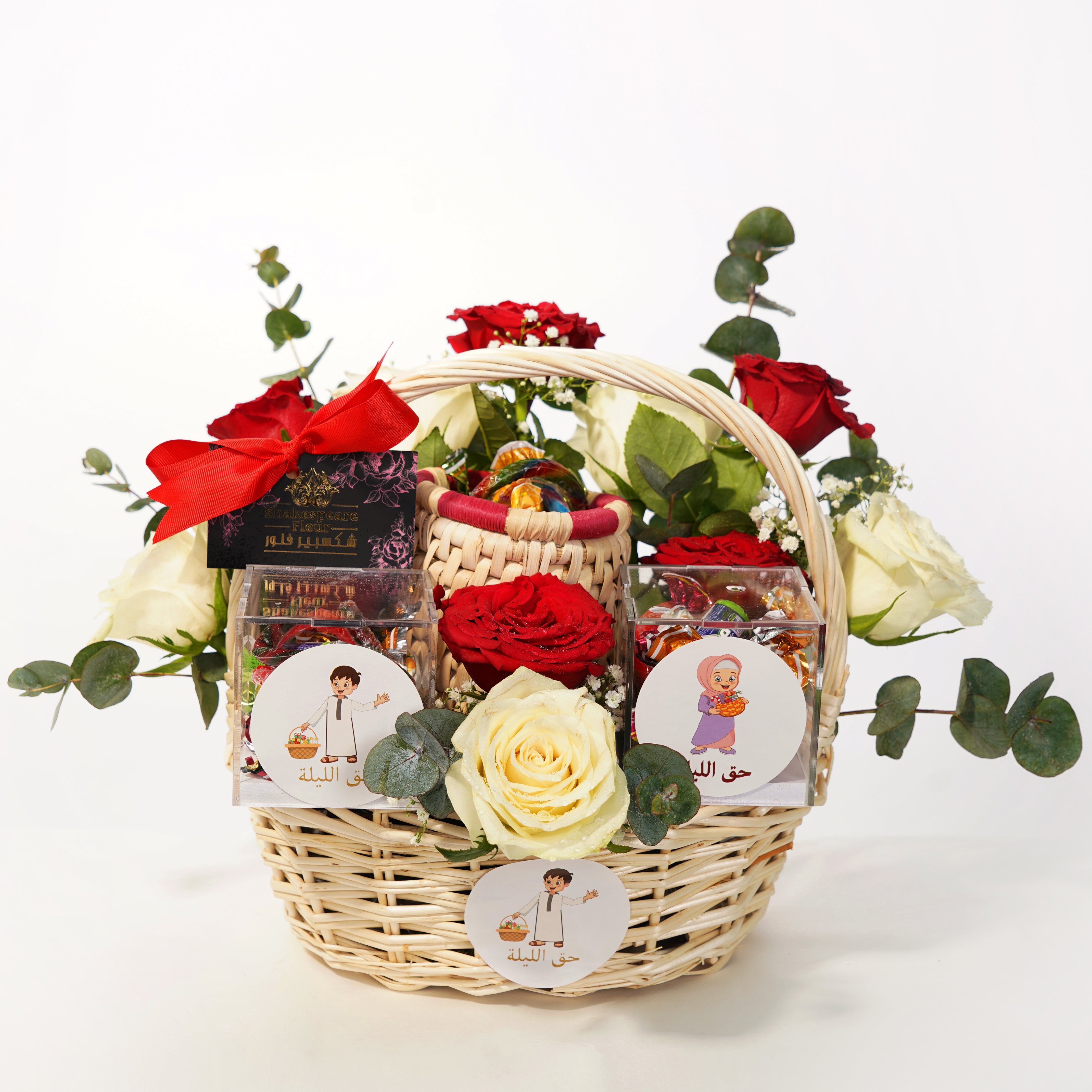 This beautifully handcrafted festive gift basket features fresh red and white roses, assorted traditional sweets, and chocolates. Elegantly arranged in a premium woven basket, it includes a charming mini handmade basket with treats, "Haq Al Laila" themed decorations, and a luxe red bow for a sophisticated touch.