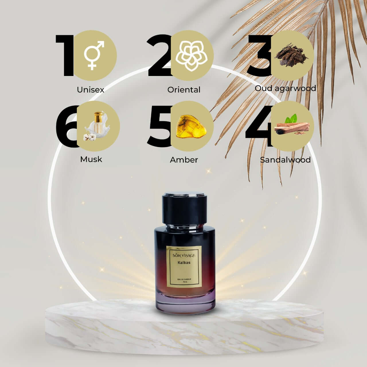 Kalkas Perfume by Son Visage, Created in 2018 under the guiding hands of Mr. Visage, targeted at a younger, modern men and woman. This oriental and musky fragrance takes you to a hidden meadow where the cedar wood first begin to musk, amber and vanilla. Oud agarwood: give a characteristic warm and intense trace.