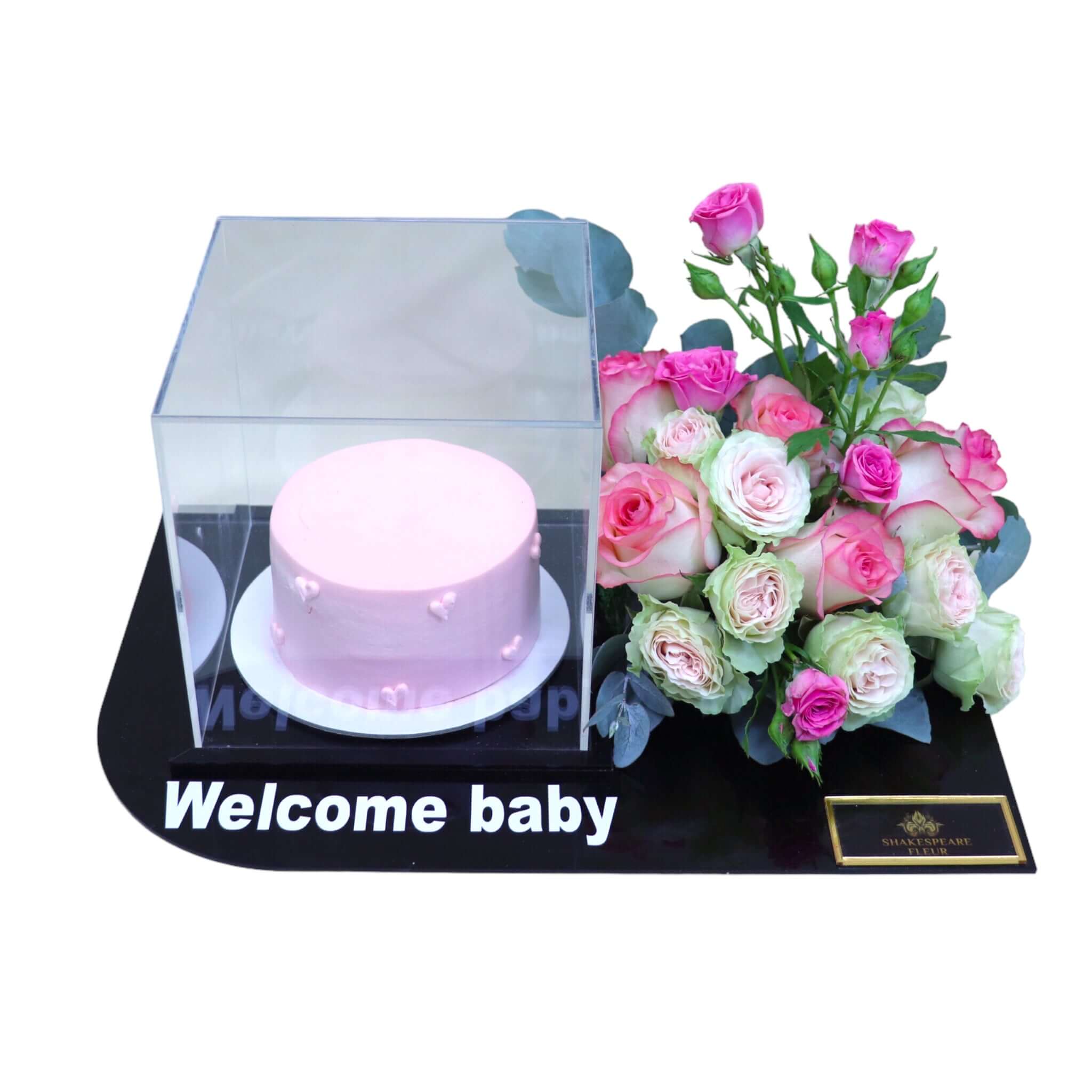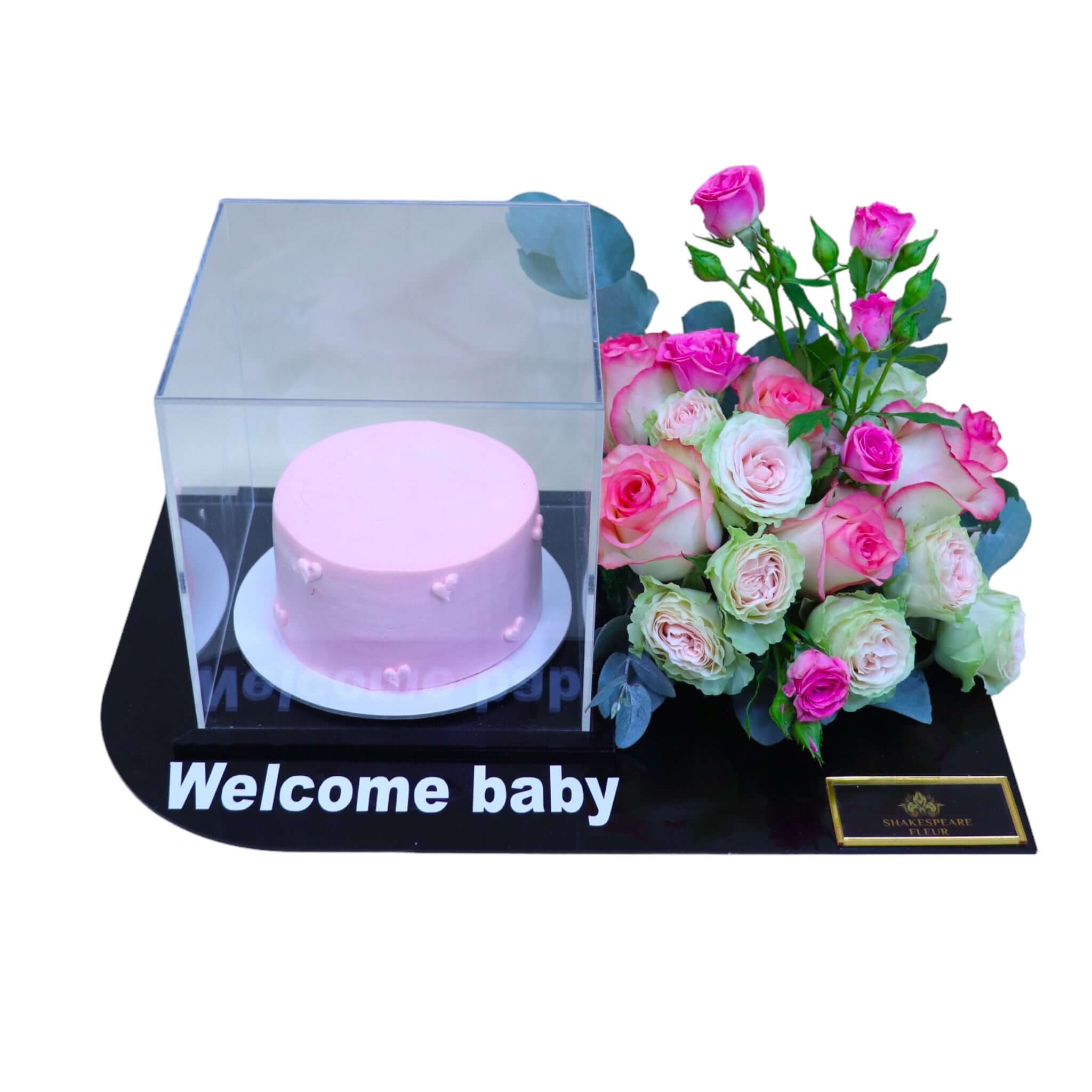7 ROSES, 4 STEM SMALL ROSE, 250GM CAKE IN ACRYLIC BOX
